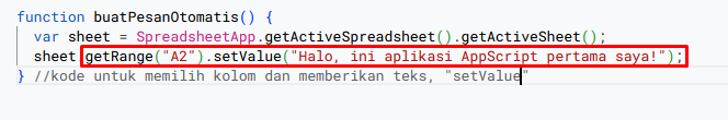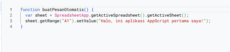 sheet.getRange("A1").setValue("Halo, ini aplikasi AppScript pertama saya!");